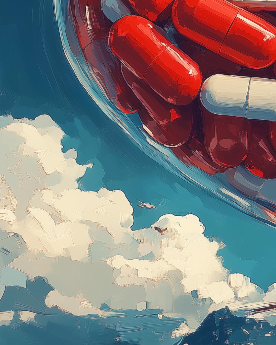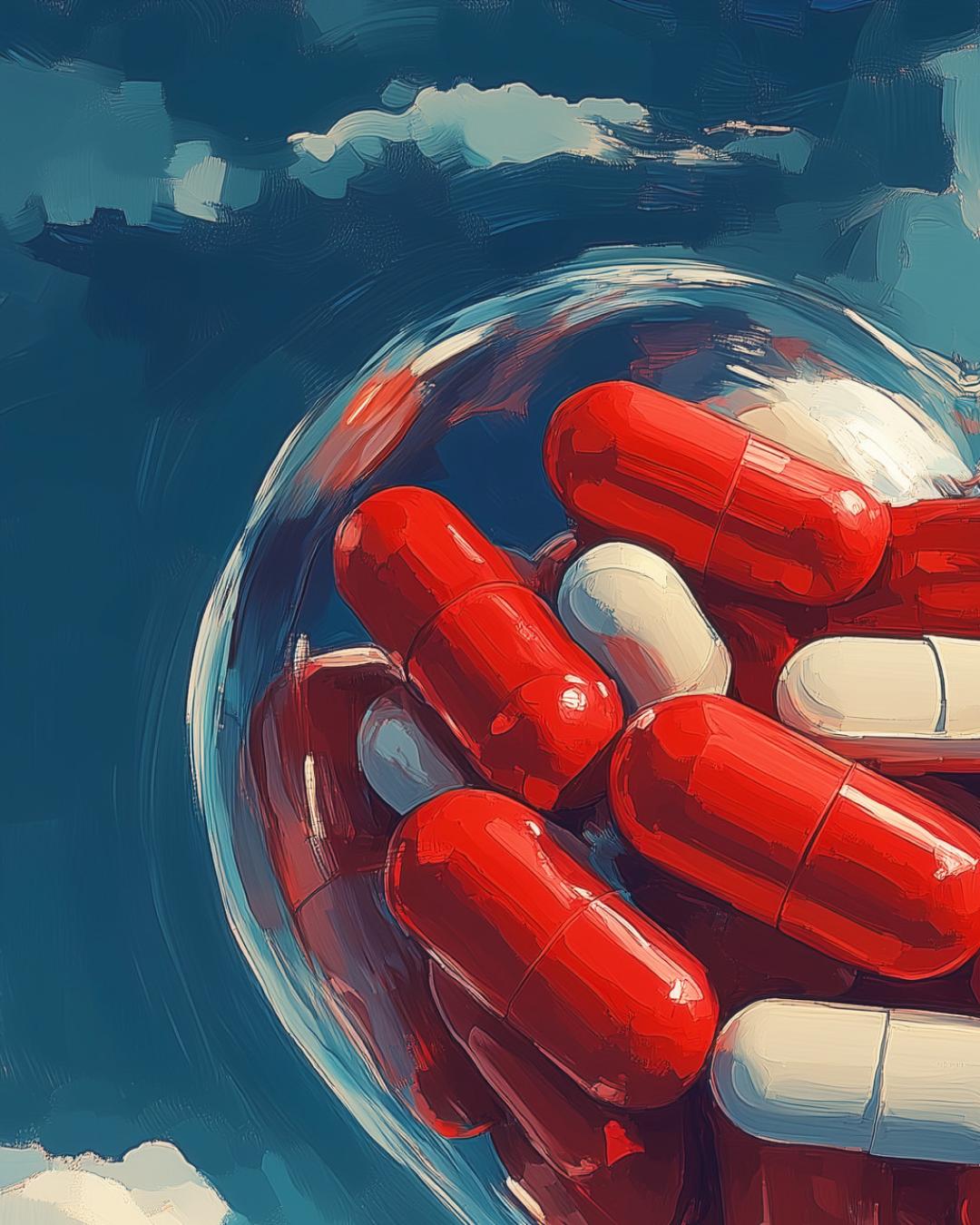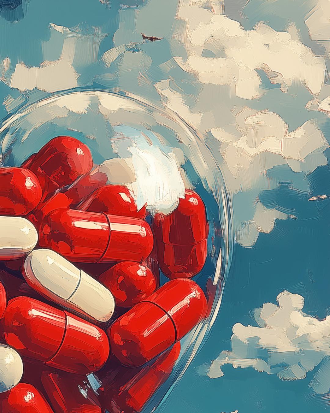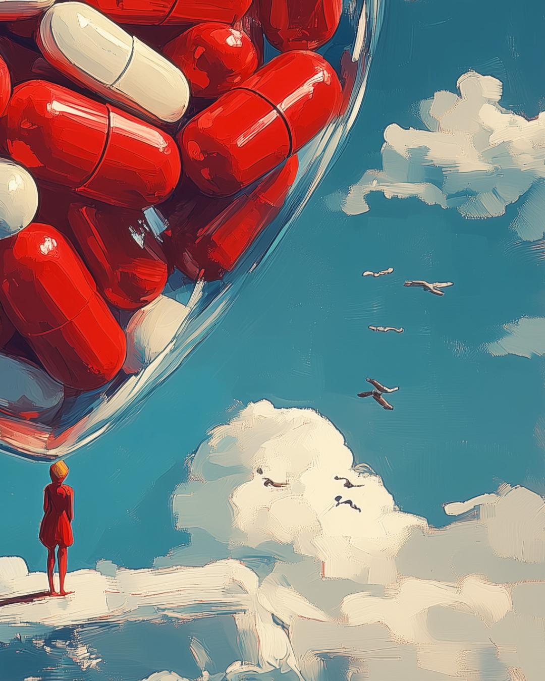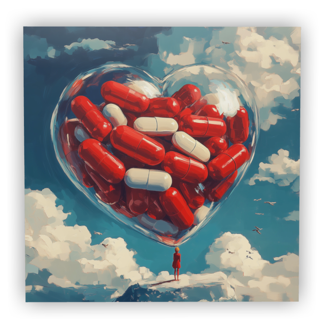 Dans ce tableau, le cœur, gigantesque et rempli de médicaments, symbolise à quel point l’amour peut être addictif, irrésistible et vital. ❤️💊 Chaque capsule représente une émotion, une sensation ou un souvenir qui nous envahit et nous transforme. Face à cette immensité, la petite silhouette humaine illustre notre fragilité : nous sommes si petits devant l’amour, pourtant nous continuons à le contempler, à l’aimer, à le désirer, même s’il nous dépasse complètement.