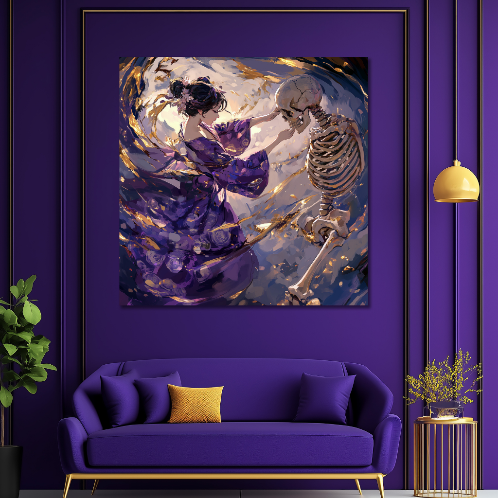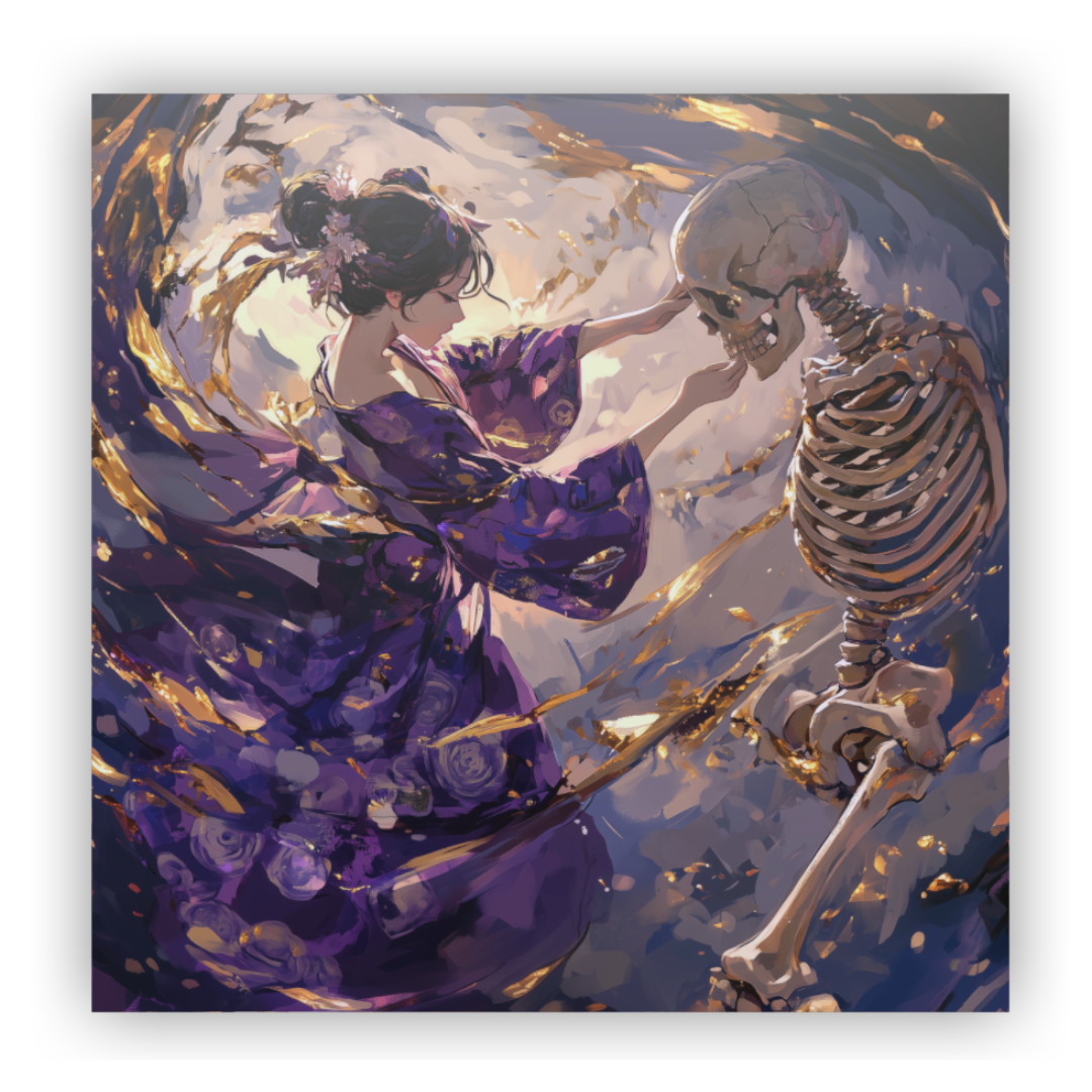 Dans une danse cosmique de lumière et de mystère, Aurum Femina illustre une rencontre unique entre une geisha envoûtante et un squelette spectral doré. Inspirée par La Création d’Adam, cette œuvre évoque le pouvoir alchimique de la transformation : chaque squelette touché par la geisha renaît en une forme dorée, un guide pour les âmes perdues. Mais cette rencontre symbolise-t-elle un nouveau départ ou un retour vers l'inconnu ? Laissez-vous transporter par cette histoire fascinante.