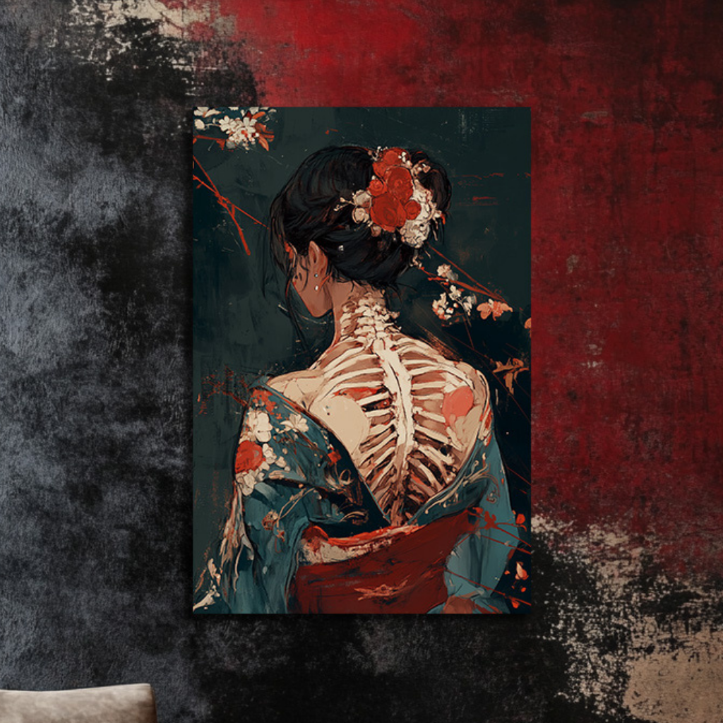 Cette œuvre révèle une femme de dos, habillée d’un kimono rouge et blanc aux motifs floraux. Les fleurs contrastent avec la blancheur spectrale de son squelette visible, créant une atmosphère aussi élégante qu’inquiétante.