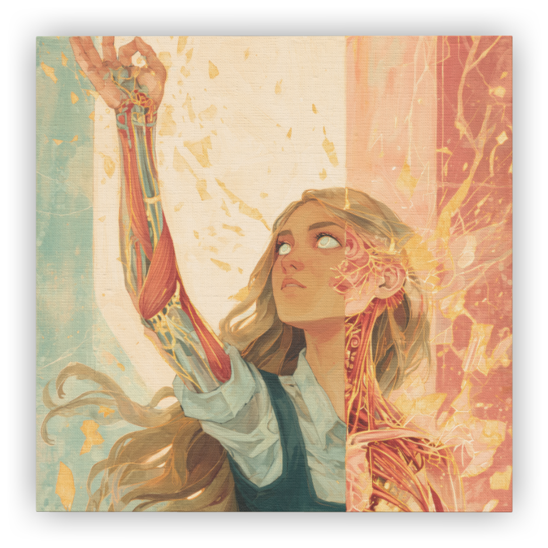 • De l’autre : la vérité anatomique, ses nerfs dorés, ses muscles translucides, ses os subtils — une cartographie intérieure qui s’illumine.