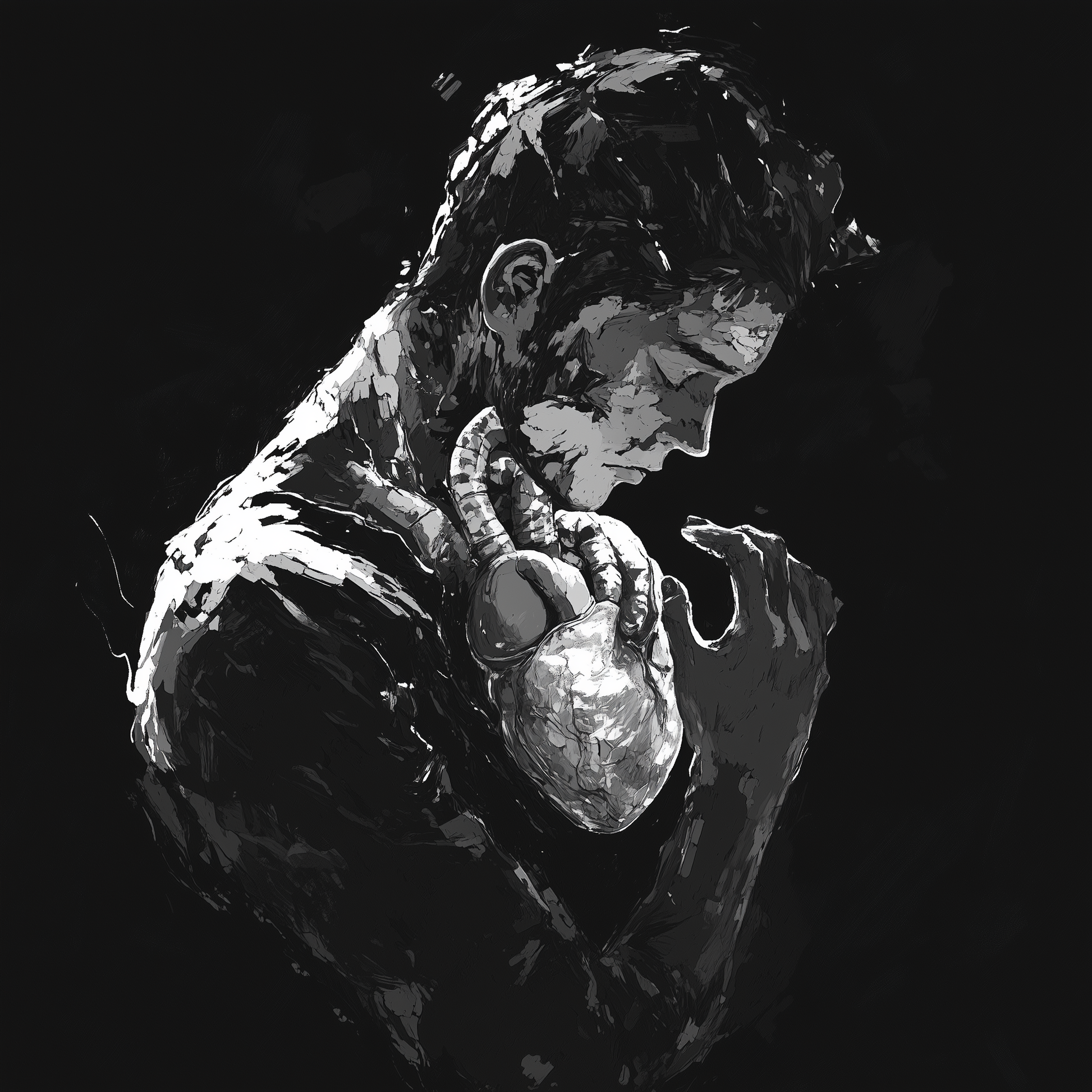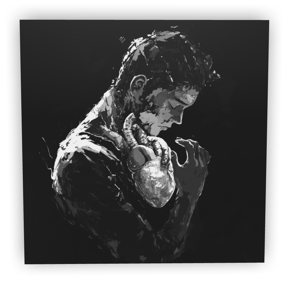 Dans Heartgrip, un homme, plongé dans l’ombre, tient son propre cœur dans ses mains. Ce geste puissant et intime symbolise la lutte entre la vulnérabilité et la force, entre ce que l’on donne et ce que l’on retient. Avec des traits monochromes saisissants et un réalisme brut, cette œuvre capture l’essence de l’émotion humaine et du combat intérieur qui anime chacun de nous.
