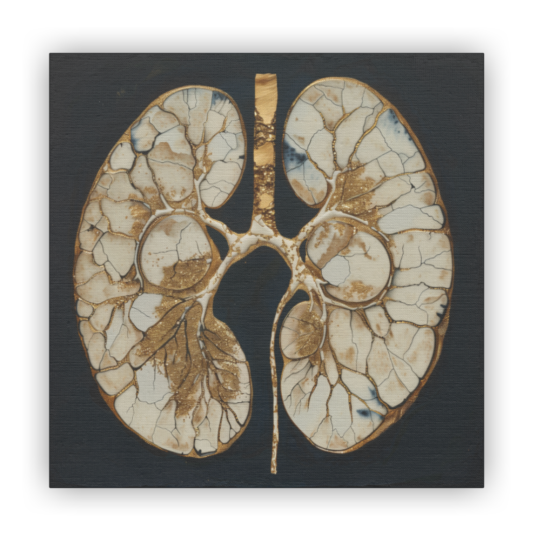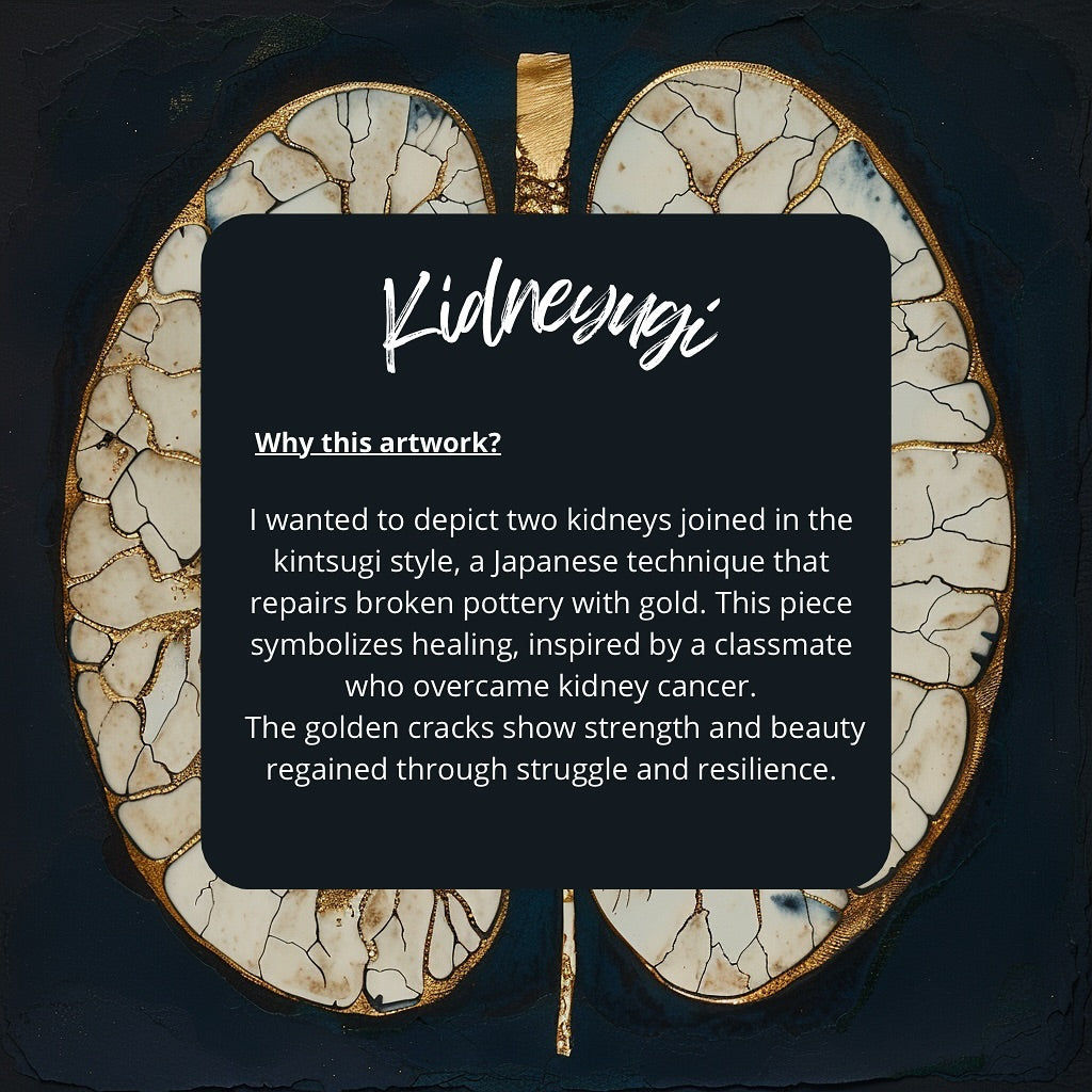 Inspiré par le kintsugi, l’art japonais de la réparation à l’or, Kidneyugi célèbre la beauté de la guérison. Cette œuvre représente deux reins humains, magnifiquement unis et restaurés avec des lignes dorées. Plus qu’un tableau, c’est un hommage à la résilience et à la valeur des imperfections réparées.