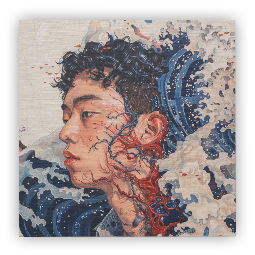 Medsan est bien plus qu’une œuvre d’art : c’est l’emblème de la collection, le reflet d’une vision où l’anatomie rencontre l’esthétique japonaise dans une danse harmonieuse. Ce tableau met en scène un visage humain, magnifié par des veines rouges et bleues qui se mêlent aux vagues tumultueuses, évoquant l’énergie de la vie et la sérénité de l’océan.