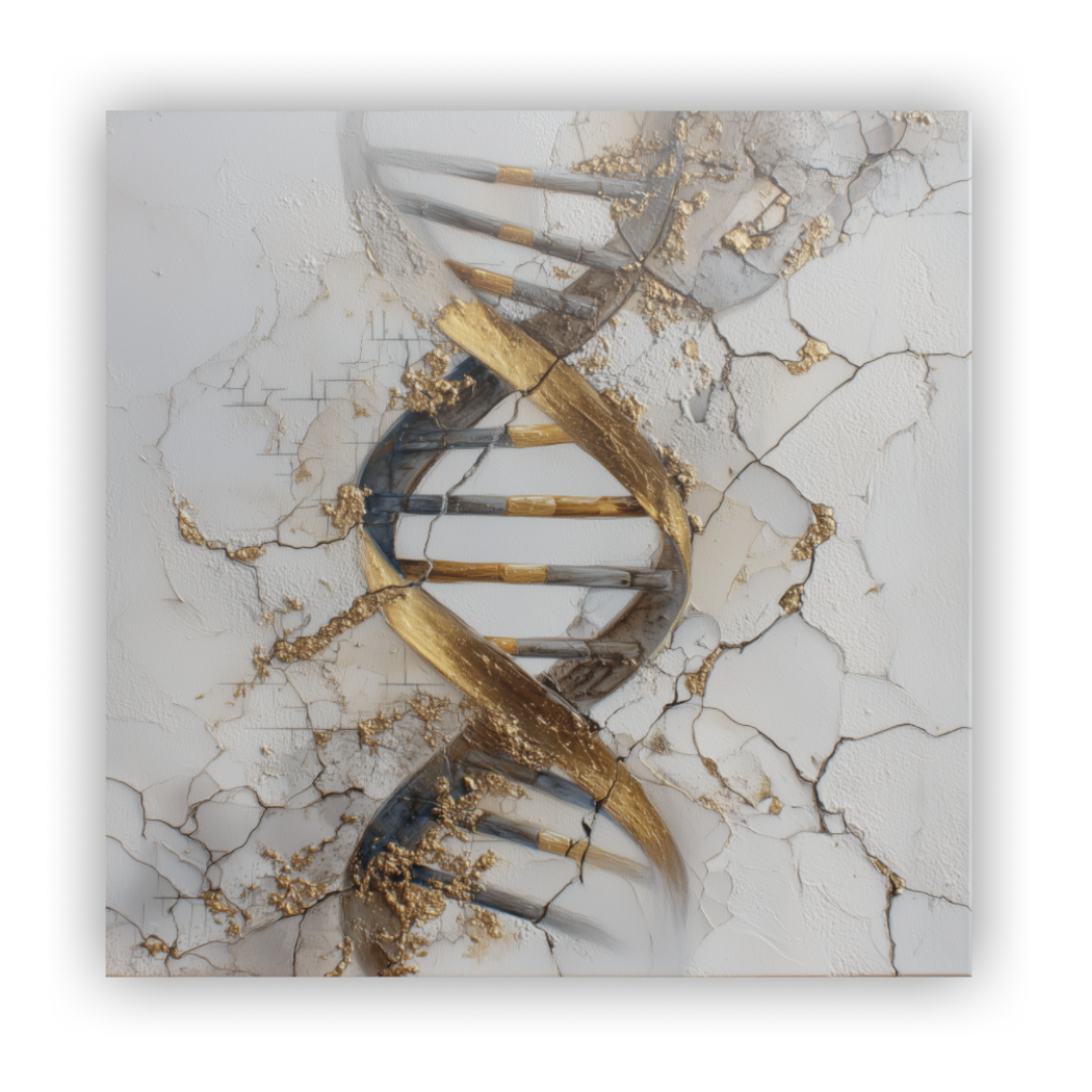L’ADN fissuré ne cherche pas à cacher ses cassures : il les met en lumière. Les veines dorées racontent l’histoire de celles et ceux qui vivent avec un bagage médical, biologique ou émotionnel… mais qui choisissent de le transformer.