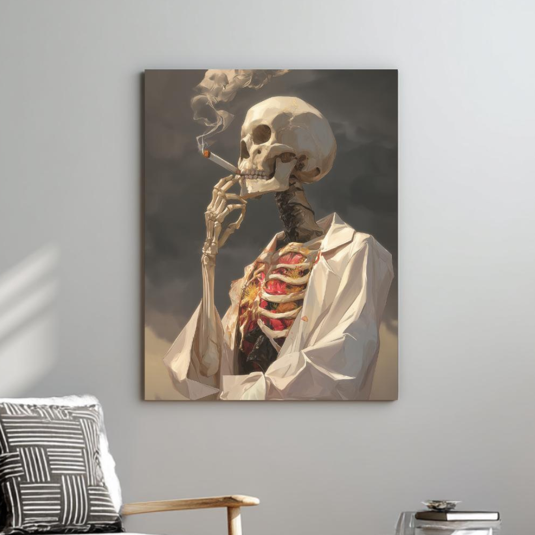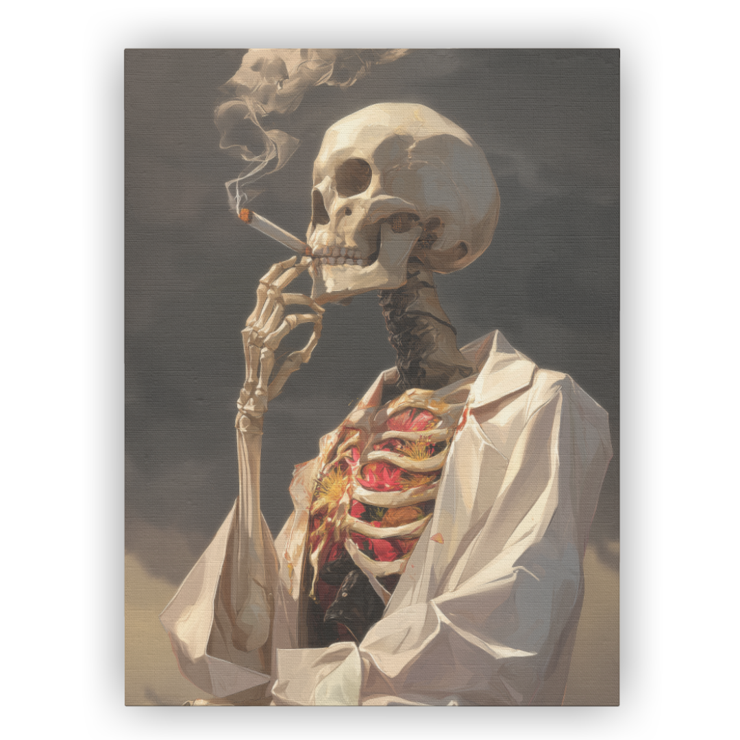 Sous la blouse blanche, il existe parfois un combat silencieux. Le Prix du Souffle dévoile une figure forte et fragile à la fois : un squelette féminin japonais en blouse médicale, debout face au crépuscule. Cigarette aux lèvres, ses poumons noircis et fissurés laissent échapper des cendres, symbole du prix payé pour chaque bouffée de répit.